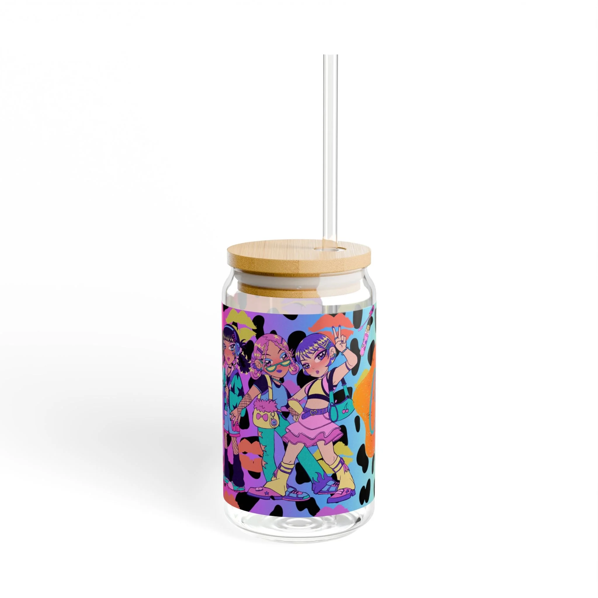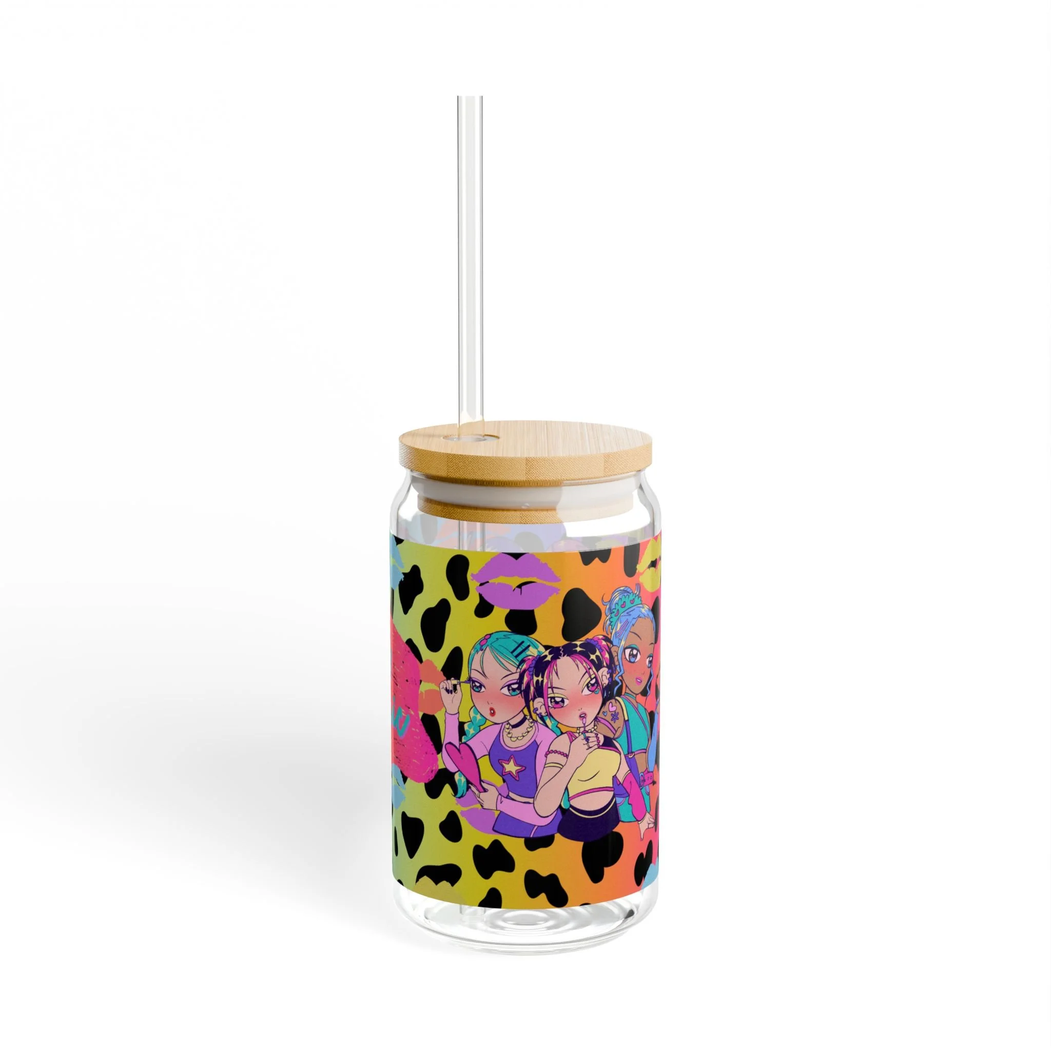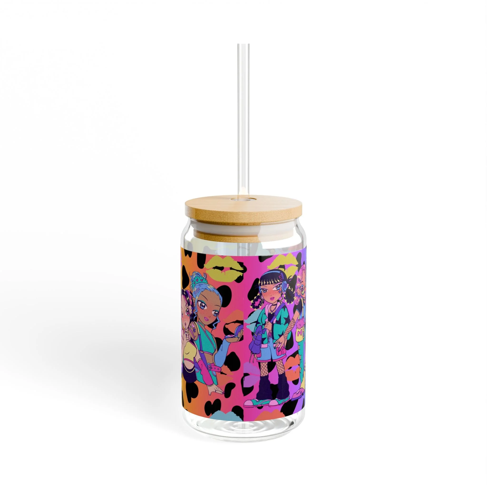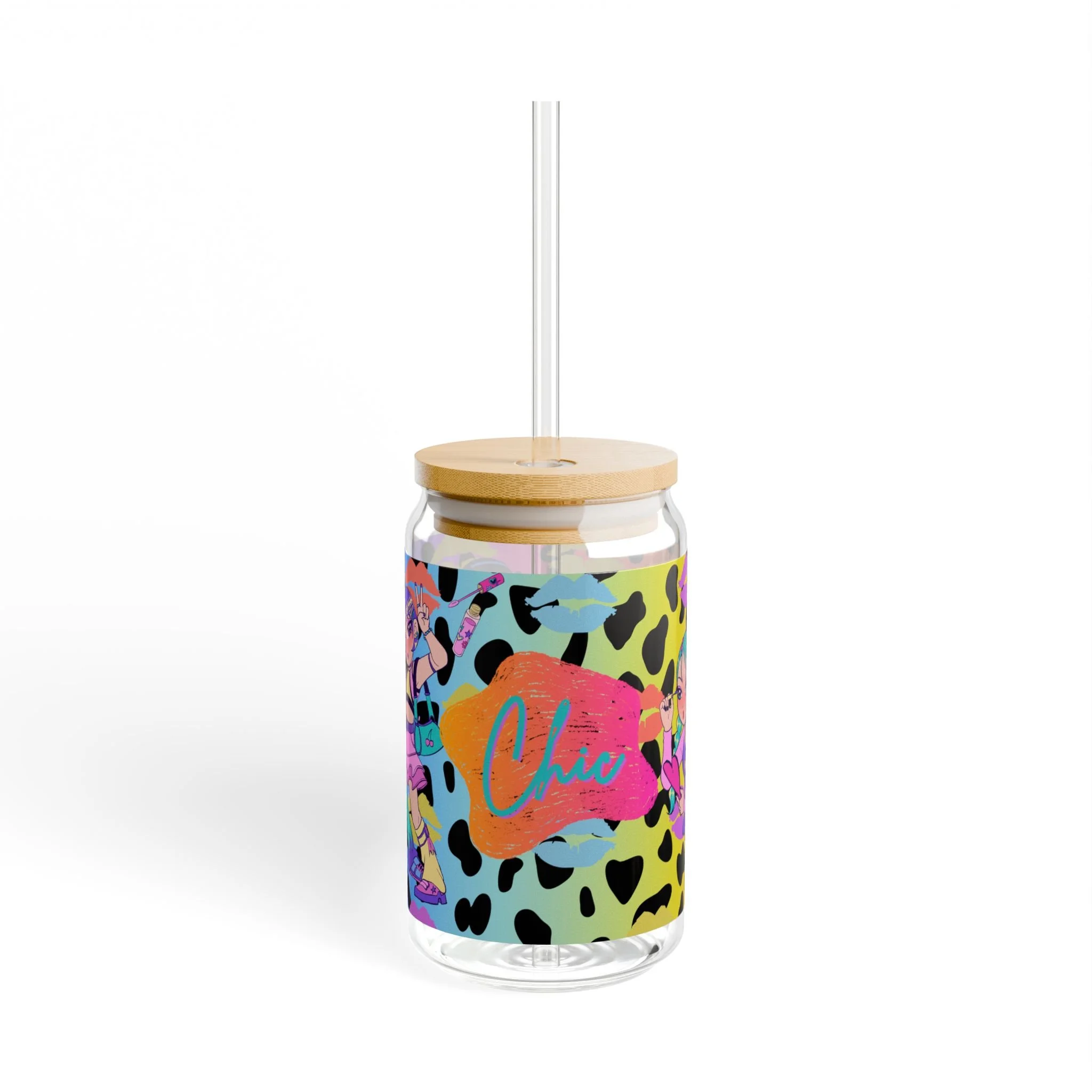 This 16oz sipper glass brings playful energy to every sip. Made from clear tempered glass, it showcases bold, vibrant prints that wrap the jar—bright splashes, neon animal spots, and lively character art create a fun, retro-pop vibe. Choose the bamboo gasket-push lid with a durable Tritan straw for spill-resistant sipping on the go, or opt for the glass alone to enjoy an unobstructed view of your drink. Hand wash only; BPA-free materials and USA assembly mean you’re getting a thoughtful, long-lasting piece that adds color to morning smoothies, afternoon iced drinks, or late-night mocktails.