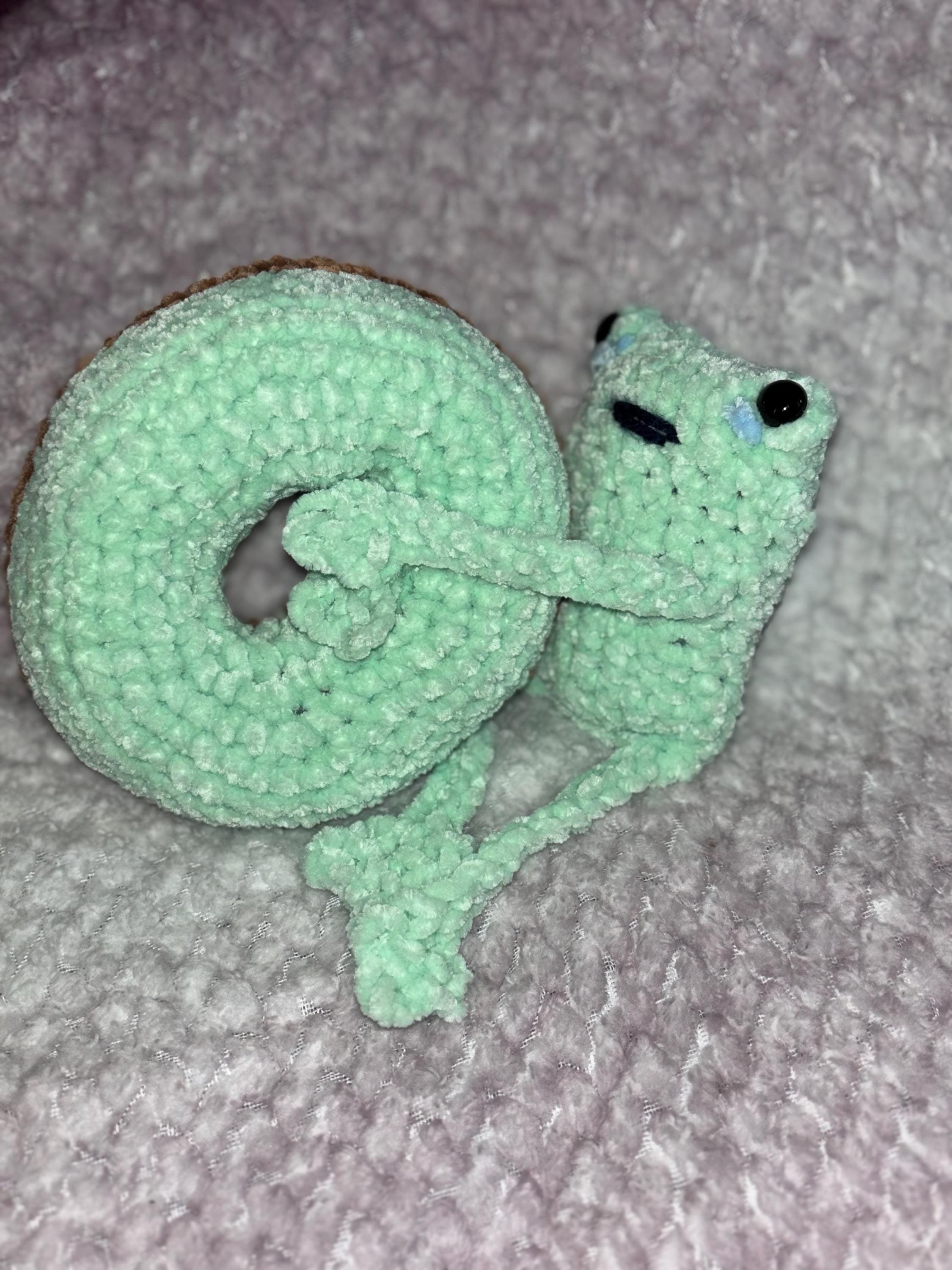 • Handcrafted with Care: Each plushie is crocheted by hand, making every donut a one-of-a-kind creation. • Luxurious Chenille Yarn: Crafted from super-soft chenille yarn, this plushie is irresistibly squishy and perfect for snuggling. • Safety Eyes: The donut’s playful face is completed with securely attached safety eyes, ensuring it’s as safe as it is cute. • Delicious Design: The mint green and chocolate brown colors create a sweet aesthetic, making it a charming addition to any plushie collection. • Perfect for All Ages: Designed with safety and softness in mind, this plushie is suitable for donut lovers of all ages.